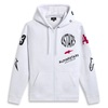 Ilustración con varios logotipos en la parte delantera, las mangas, la espalda y la capucha